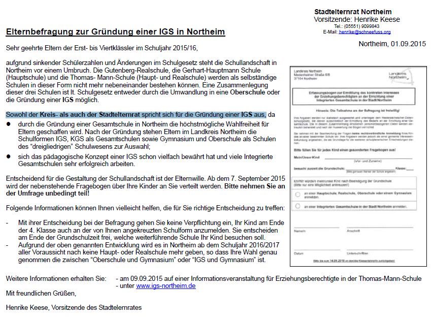 WENN es wirklich unumgänglich sein sollte, dass Schulen in Northeim zusammengelegt werden müssen, dann MUSS es eine erneute Umfrage bei den Eltern geben, die diesmal nur die beiden Alternativen „OBS“ oder „IGS“ bietet.